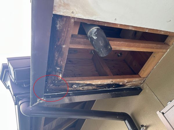 はじめに、OB施主様から「雨が漏っているかも」と連絡がありました。現場調査に出かけると、ベランダ下の天井にシミがあり(①黄色矢印のところ)、腐食している様子が見受けられました。