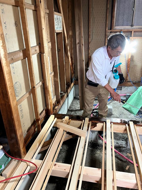洗面所を解体すると木部の腐りが目立ちました。その為、防蟻処理を行ないました。