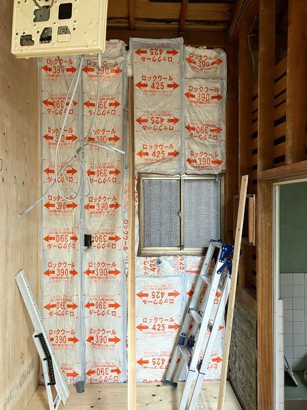 内部の壁はプラスターボードを張り、壁紙の施工に備えます。