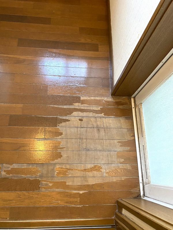 排水は詰まりが酷く、洗面のシャワーホースと給水管からの水漏れもありました。その為、洗面台付近の床や壁は膨れや汚れが目立ちました。