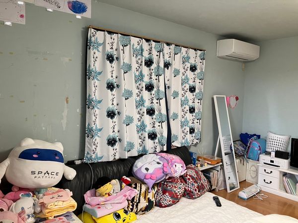 グレーの壁紙で、シンプルな部屋に仕上がりました。