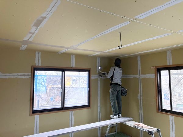 現在、珪藻土の壁・天井になっていて、それを白い壁紙に貼り替えたい。とのご希望です。