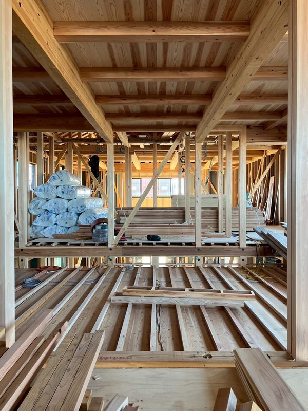 こちらは逆サイドの大きな吹抜けエリア。仮の床板を張って工事を進めています。