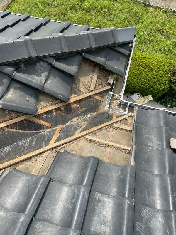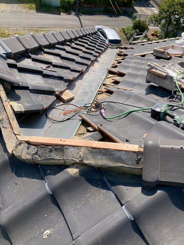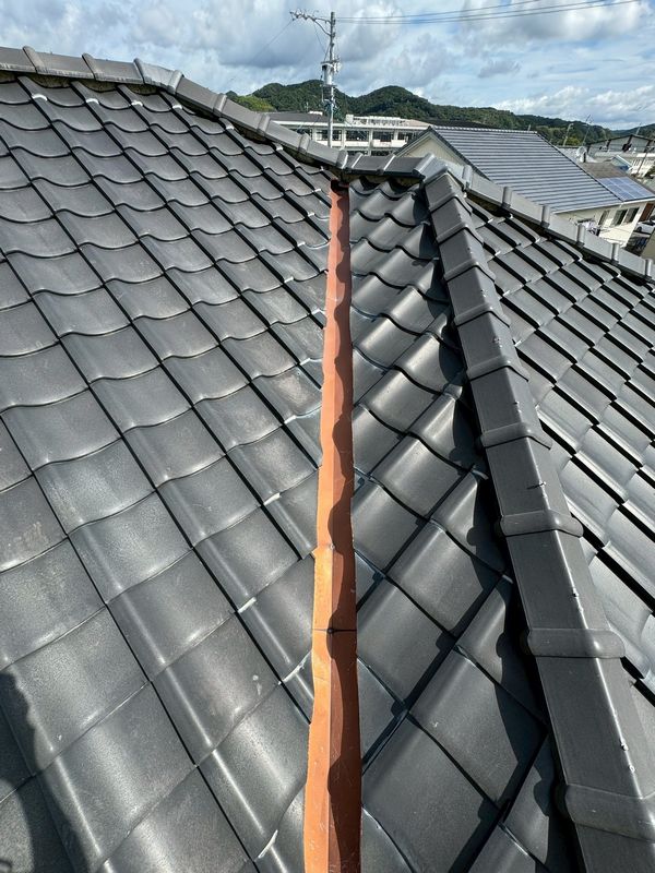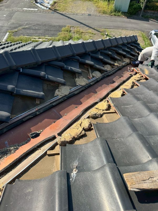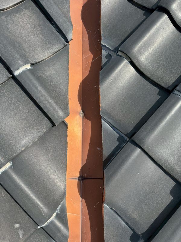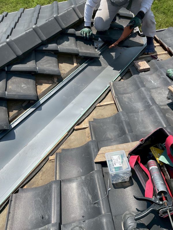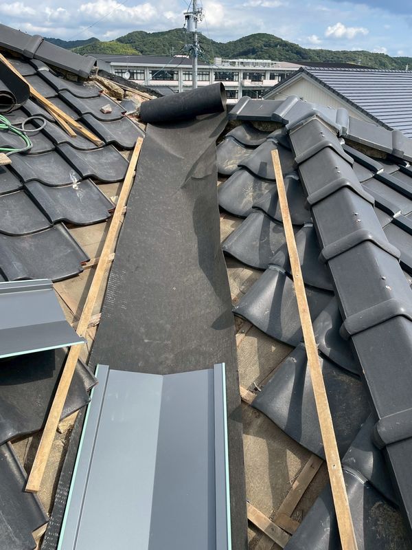 劣化した谷樋周辺の瓦を取り外し、アスファルトルーフィング(防水シート)、ステンレス製の谷樋を新たに施工します。
