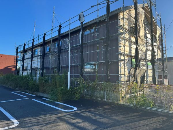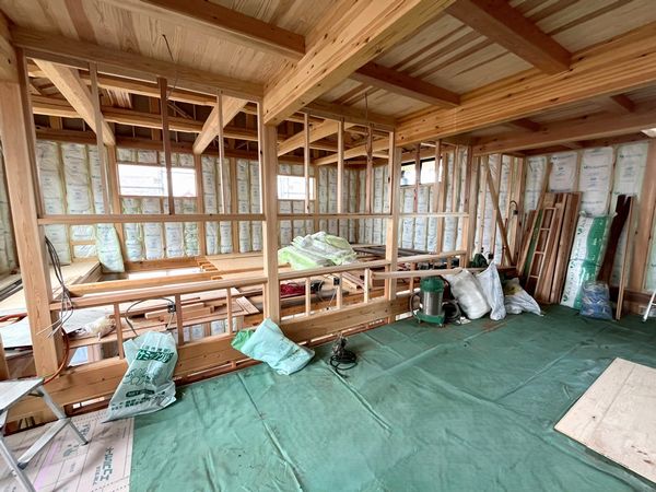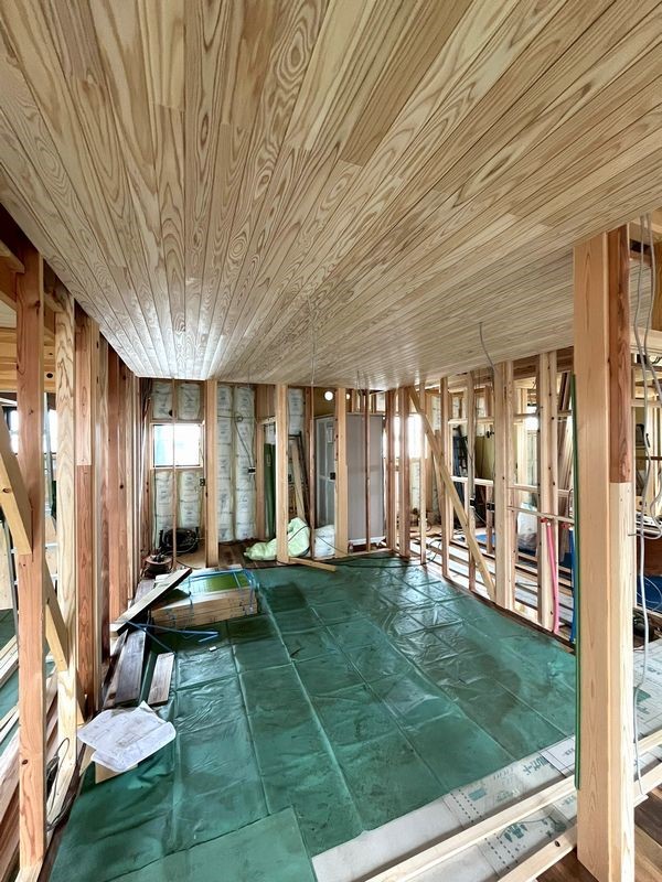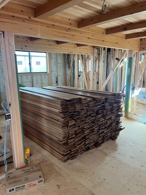 枠材の施工が進んでいた牧之原市の店舗新築工事現場では、床張工事・外壁工事が始まりました。