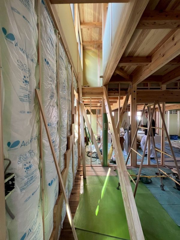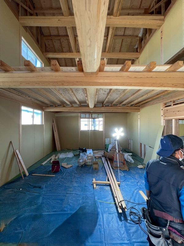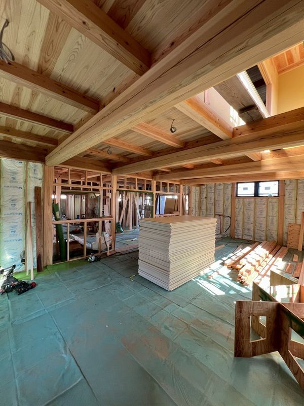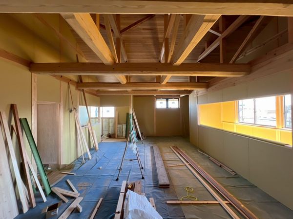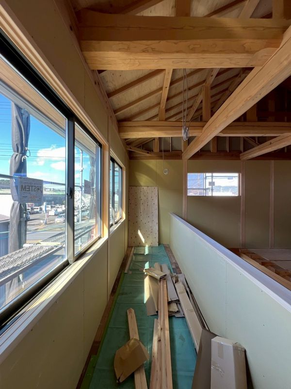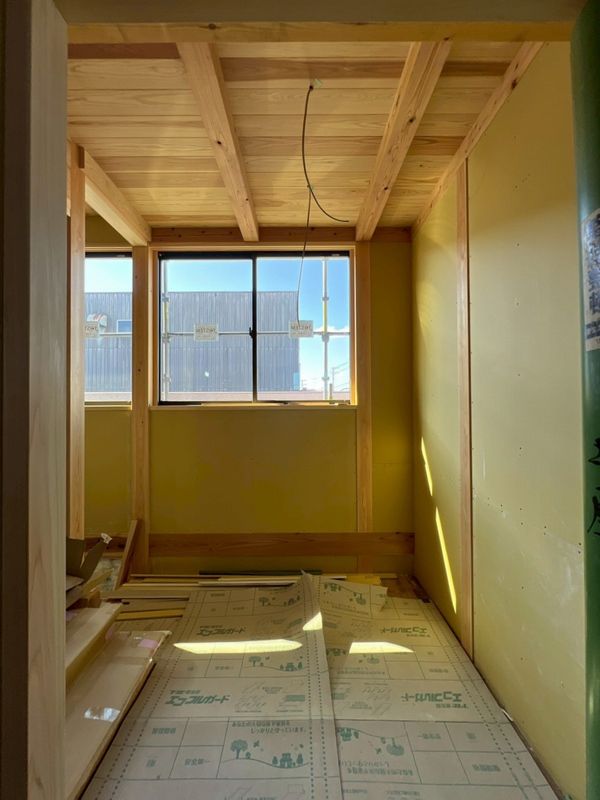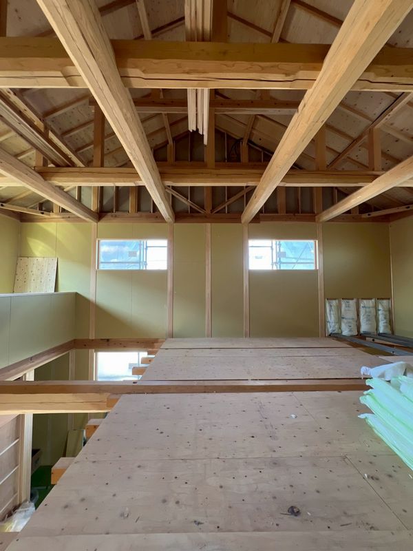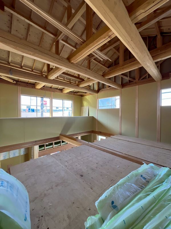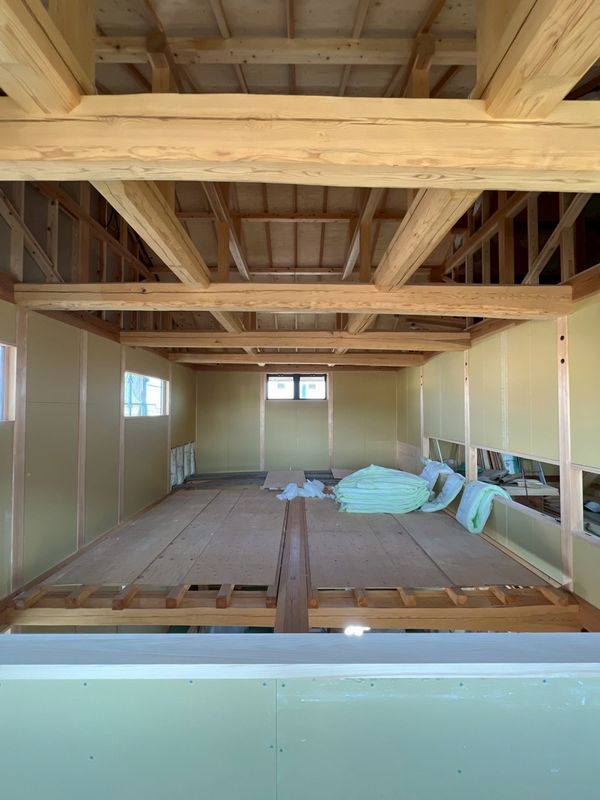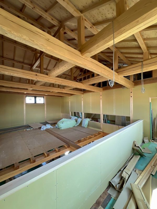 2階はほぼプラスターボードの施工が完了しており、骨組みだった現場の風景がガラッと変わっています。