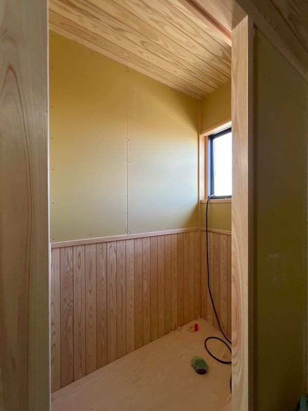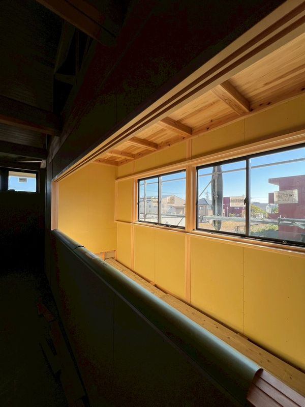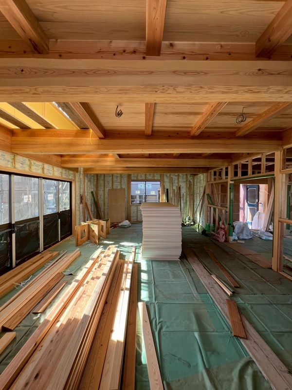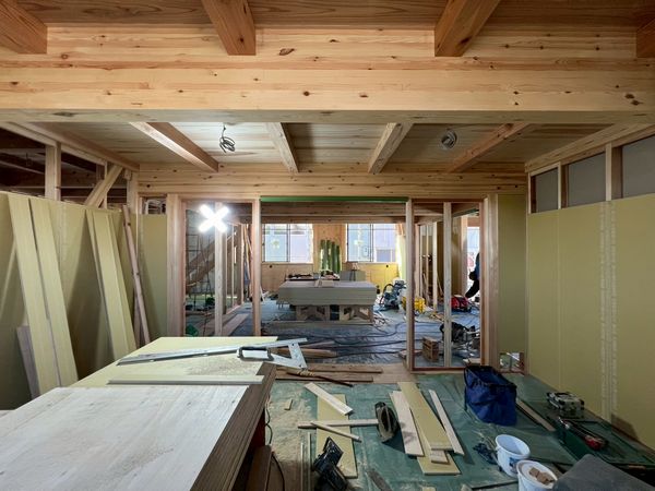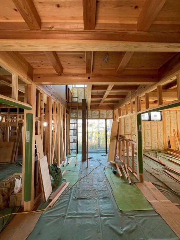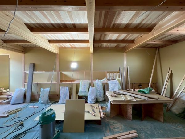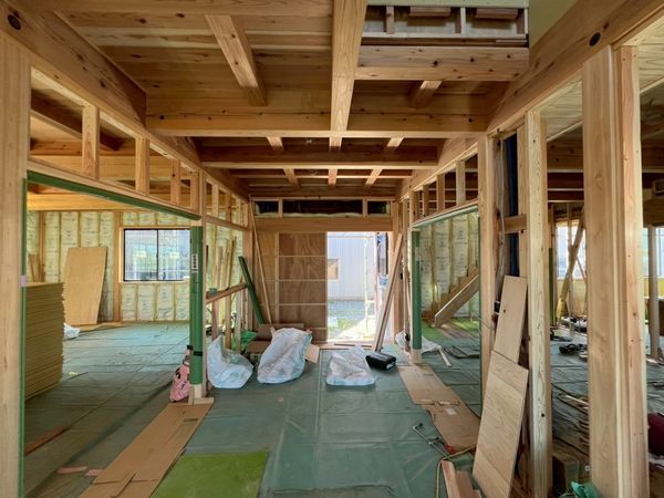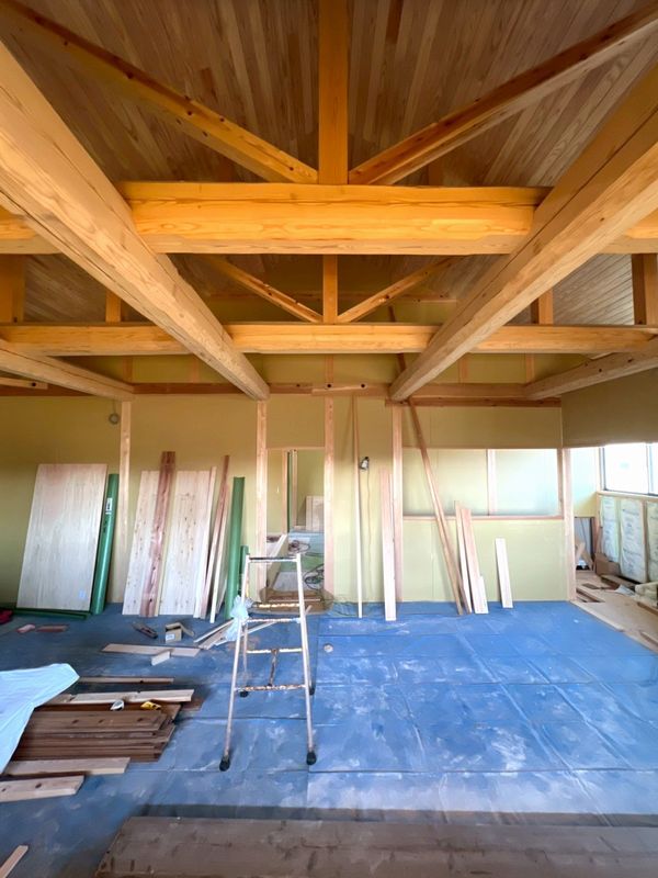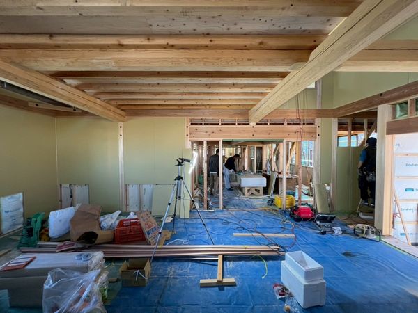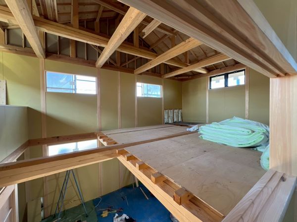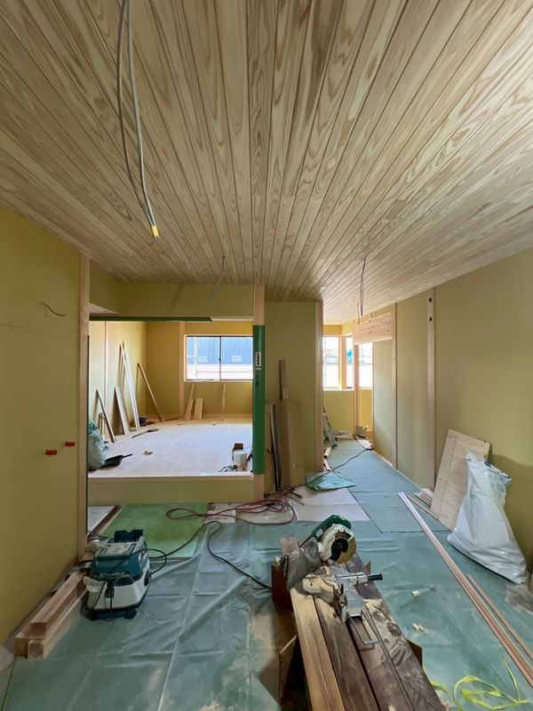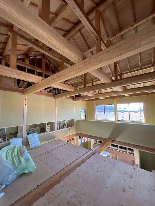 2階はほぼプラスターボードの施工が完了しており、骨組みだった現場の風景がガラッと変わっています。