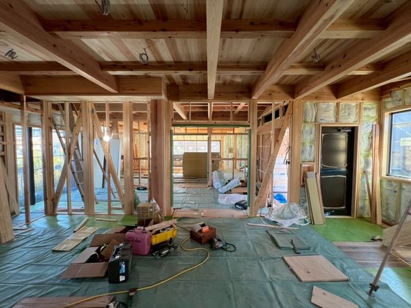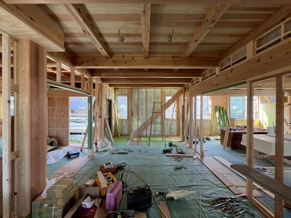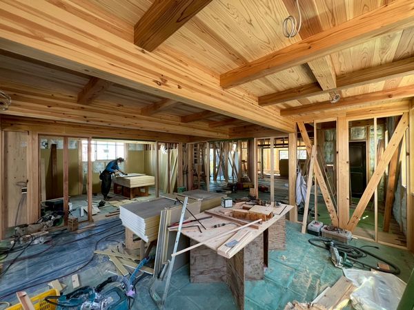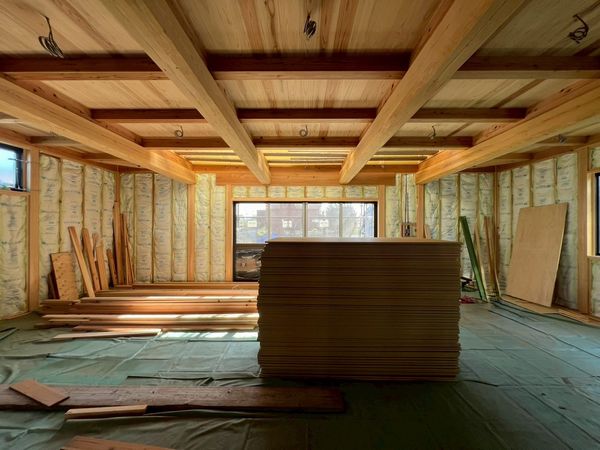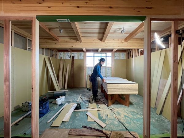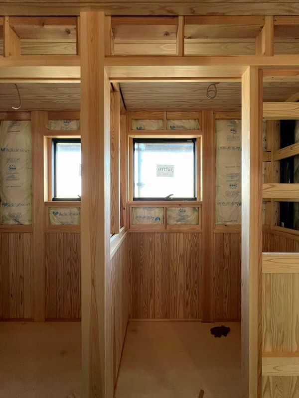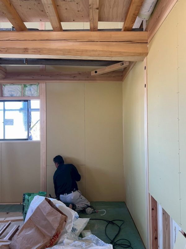 露出する柱と柱の間にプラスターボードを施工するため、柱の上から施工する大壁と違い、手間と時間がかかります。