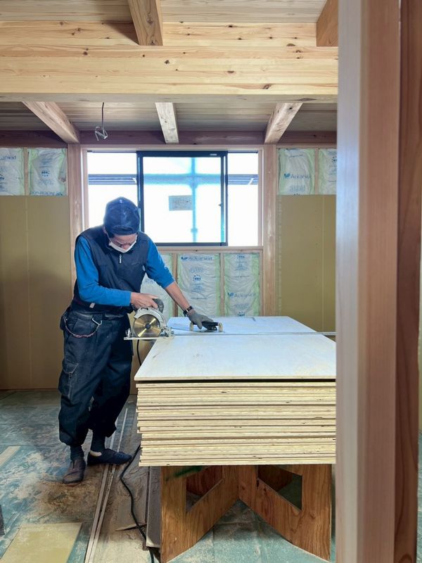 内部では1階のプラスターボードを施工中。