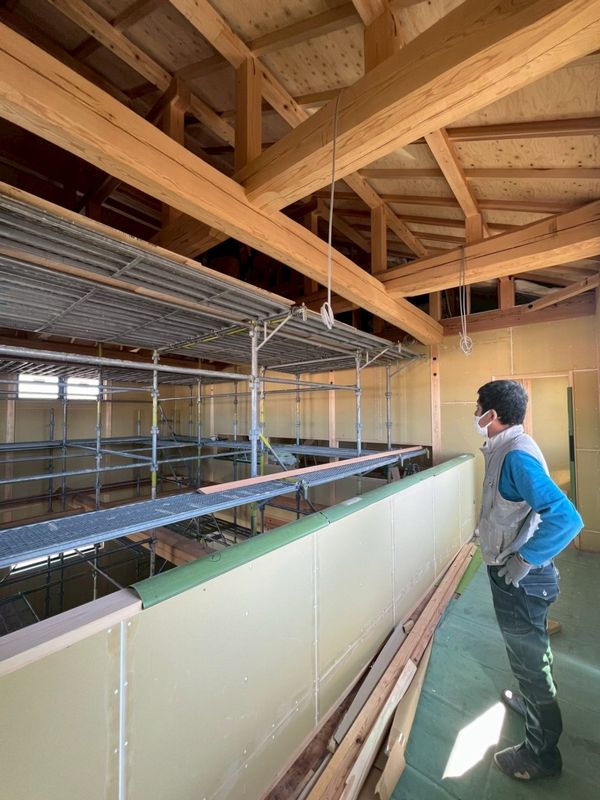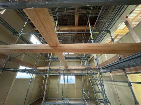 これから大工さんは梁より上部の、断熱・天井・壁の施工に入っていただきます。
