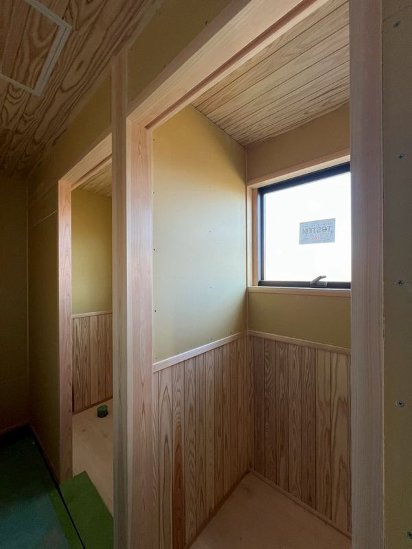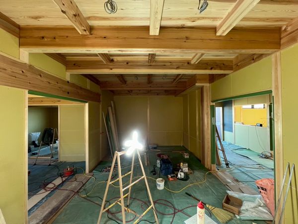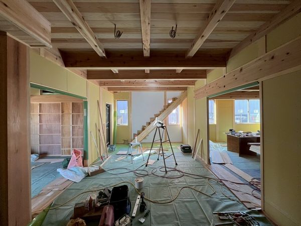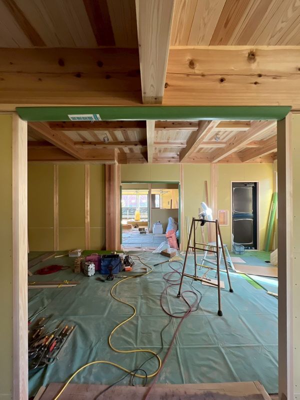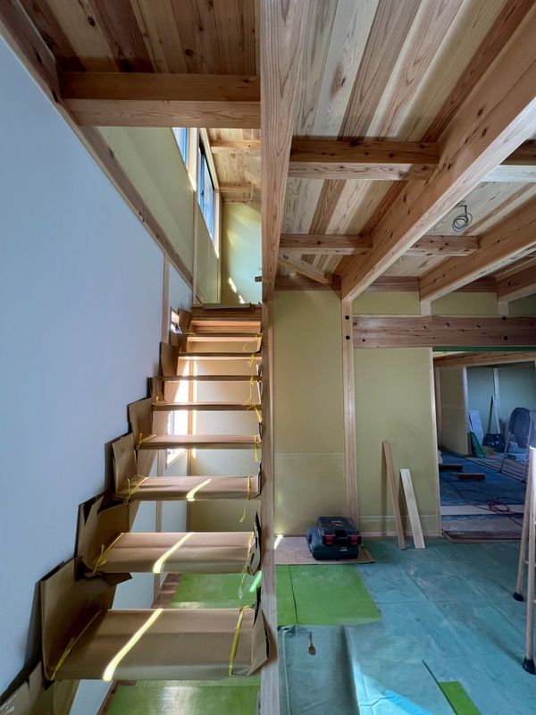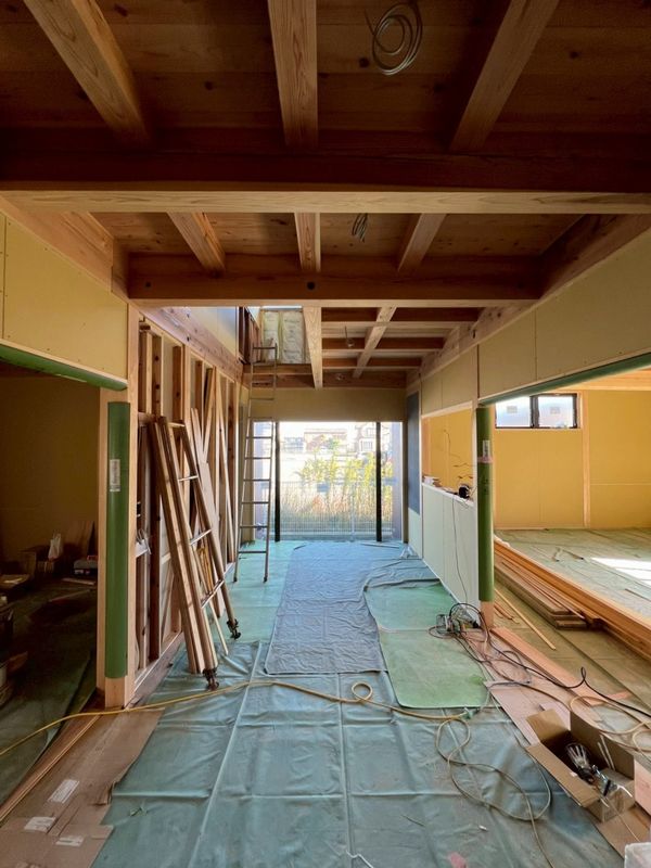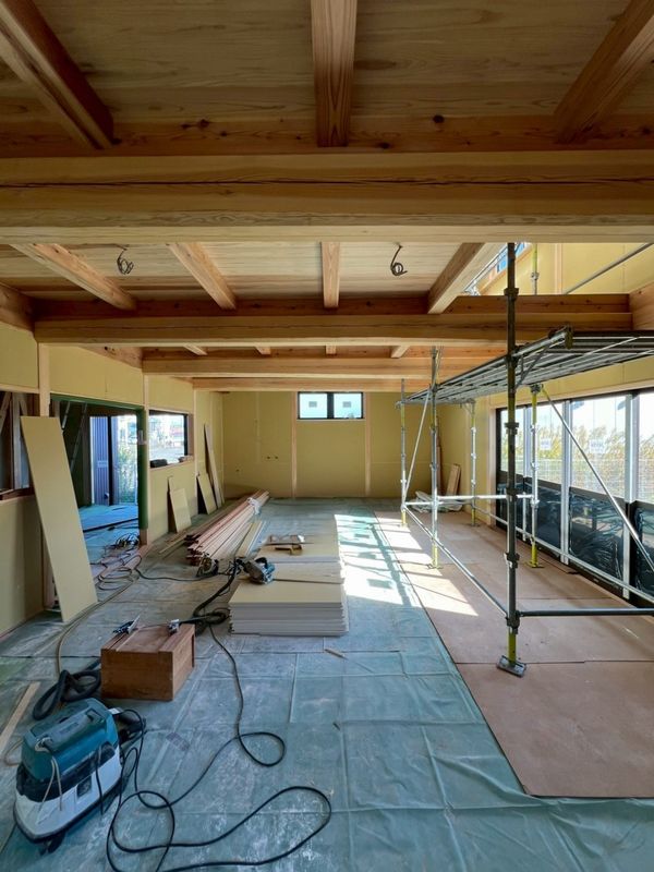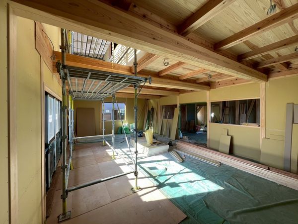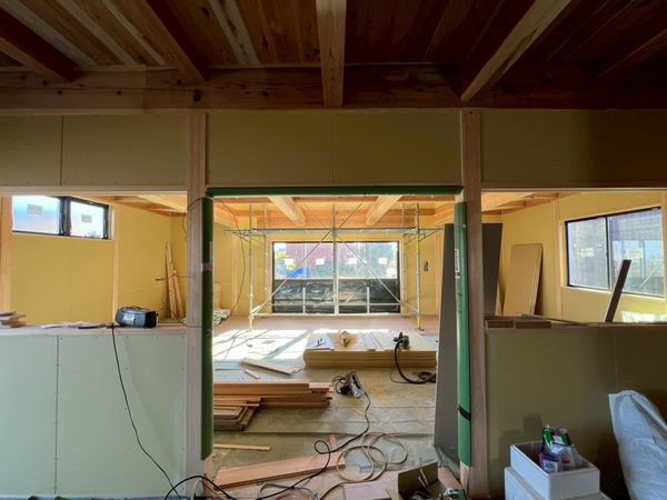 内部では、2階に引き続き1階のプラスターボードの施工が完了しています。
