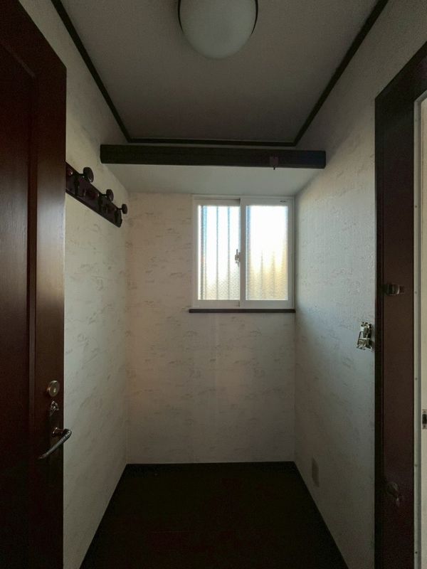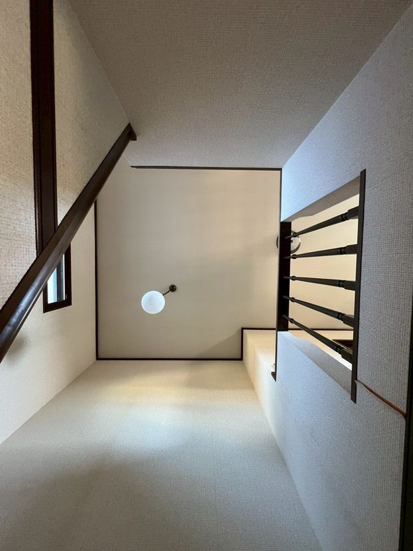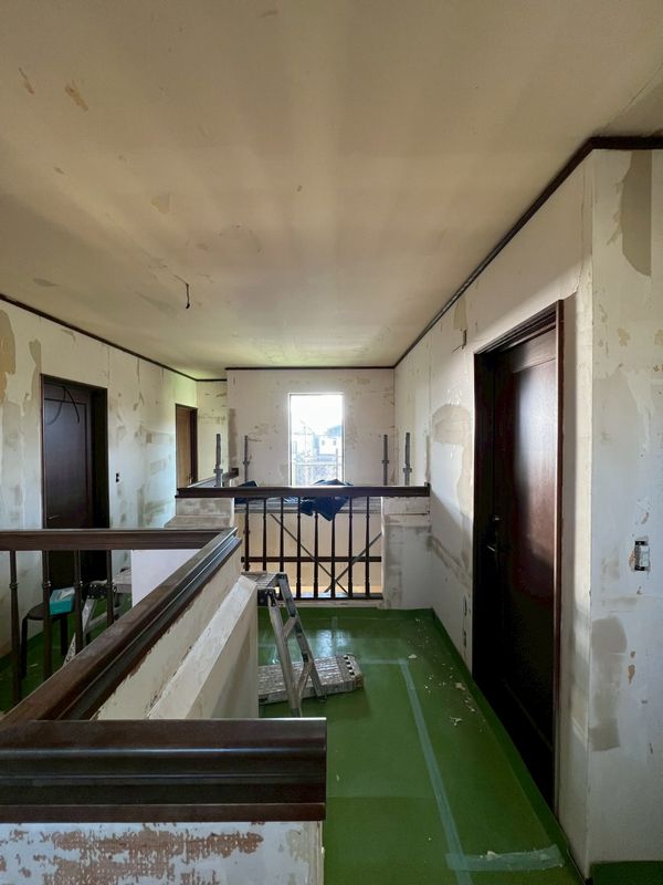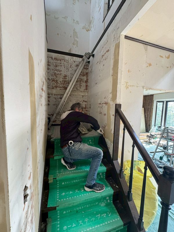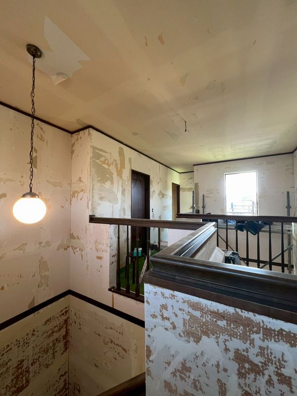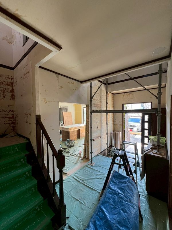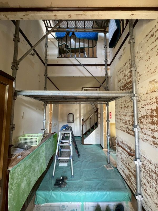 吹抜けホールはクロスを全面張り替えるので足場を設置し作業を進めます
