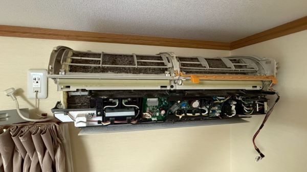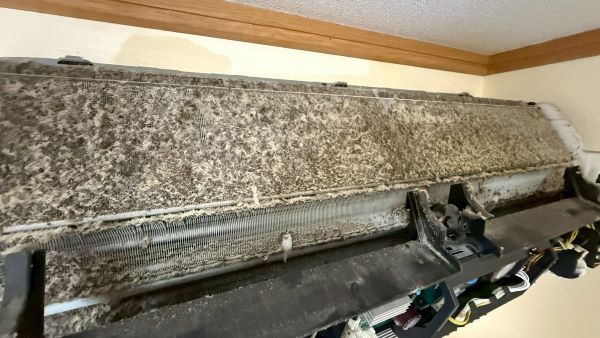 外から見た感じでは、エアコンの吹き出し口に黒カビが発生している状態。