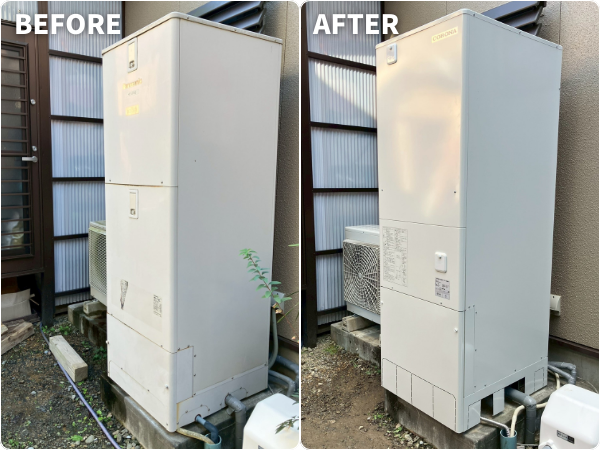 T様邸では、水漏れの不安があった既存のエコキュート(パナソニック HE-S37EQ)から、