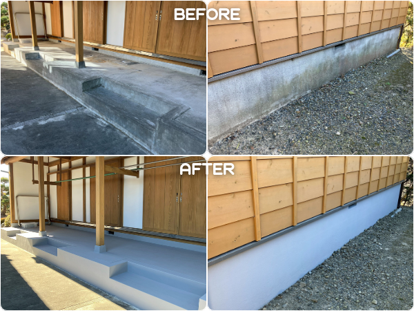 焼津市:年数経過した犬走り -基礎のクラック補修+透湿塗装で耐久性も美観もアップ