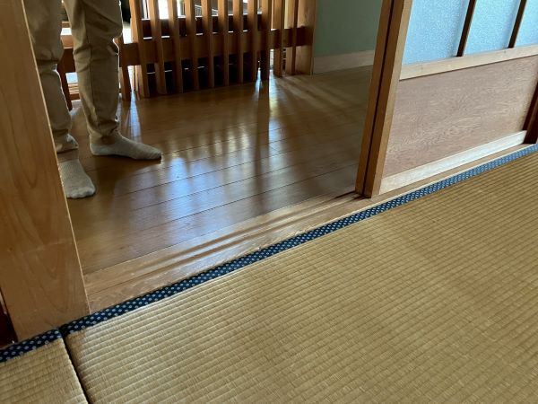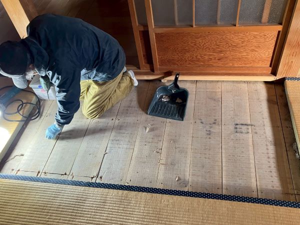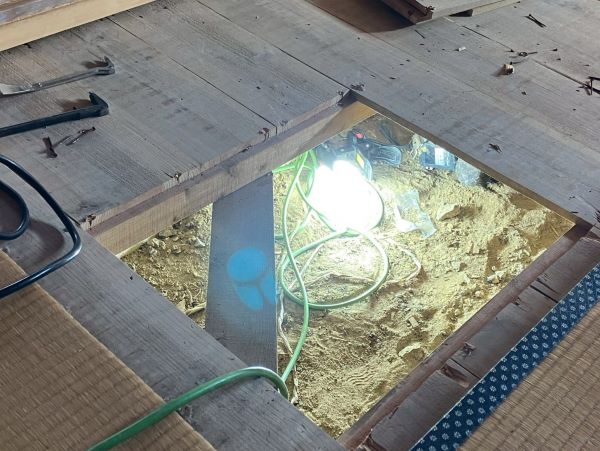 和室の床の一部を剥がしてもぐり、床下から状況を確認します