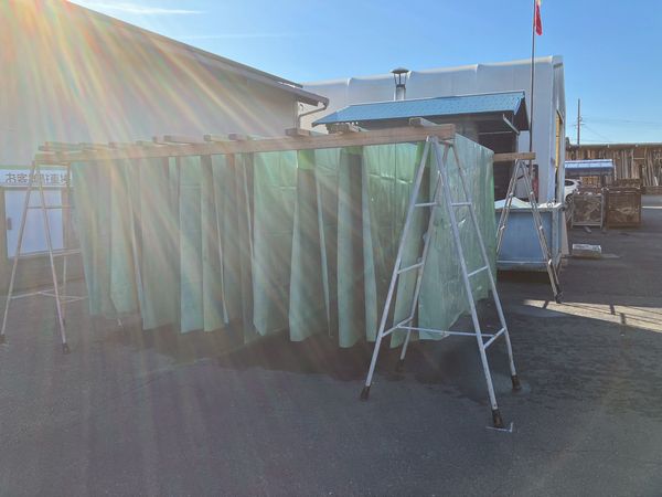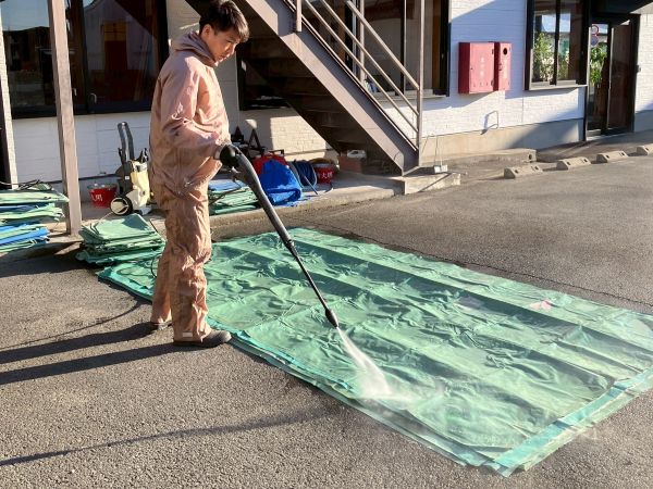次の現場が控えているので、3日がかりで溜まった養生シートを洗浄しました。