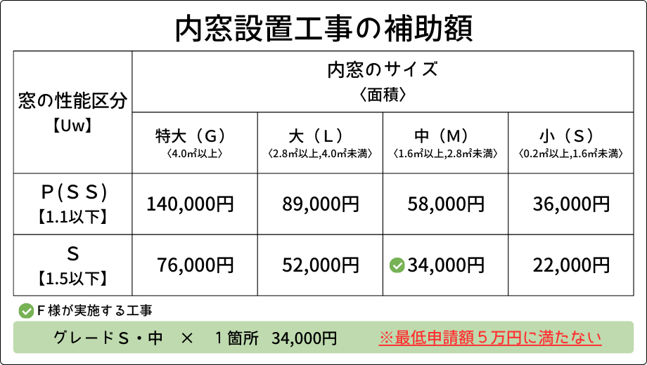 今回は内窓1箇所のピンポイント工事だったため、1回の申請につき最低ラインとされる「合計補助額5万円以上」という条件に、そもそも届いていません。