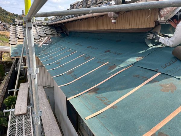 屋根下葺材の、アスファルトルーフィング(防水シート)を施工