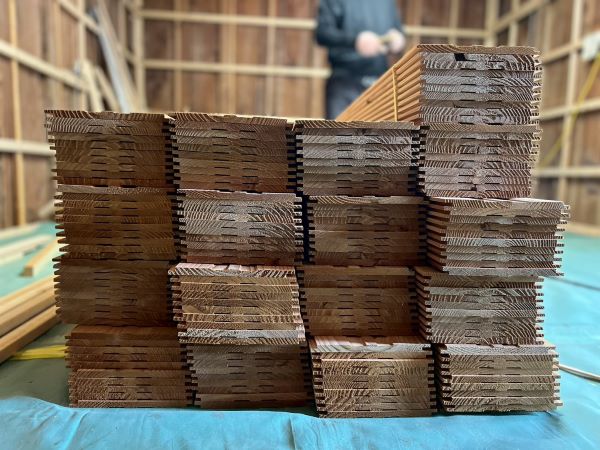 現場には、壁の仕上げとなる羽目板を搬入