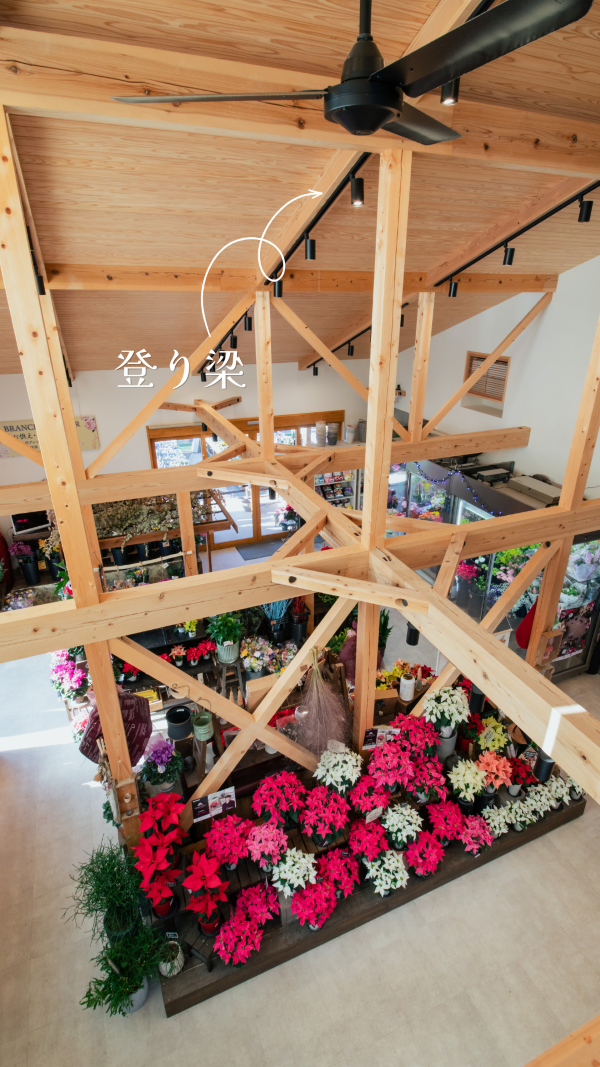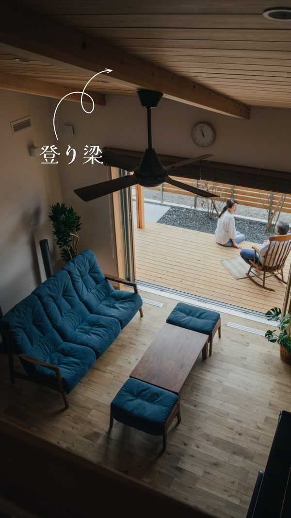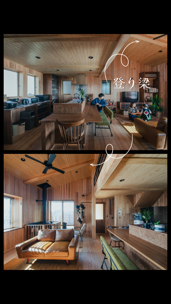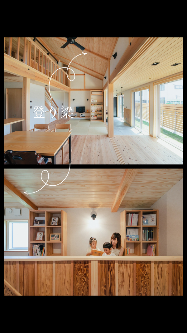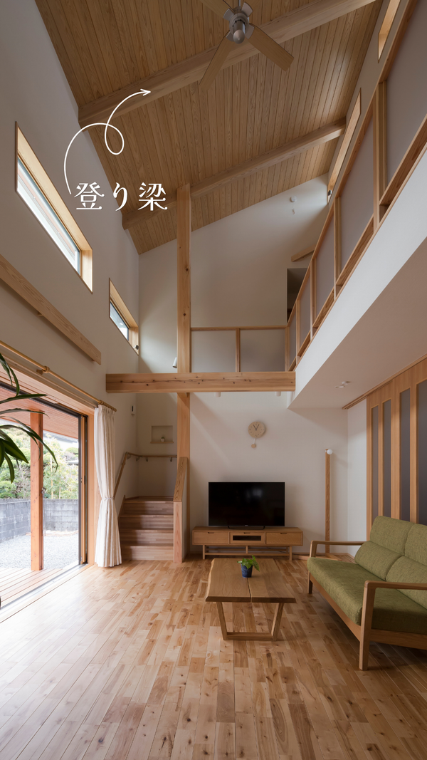登り梁はこのように、ロフト・吹抜け・店舗などの開放的な空間をつくります。