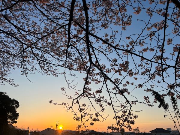 朝焼けの中、桜の花が太陽の光を静かに迎え入れる瞬間。