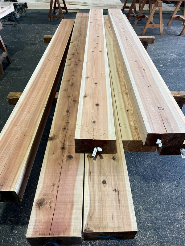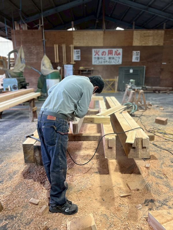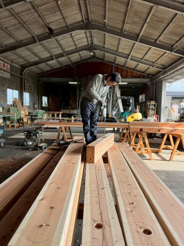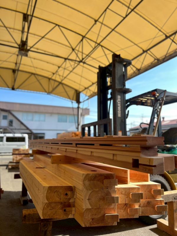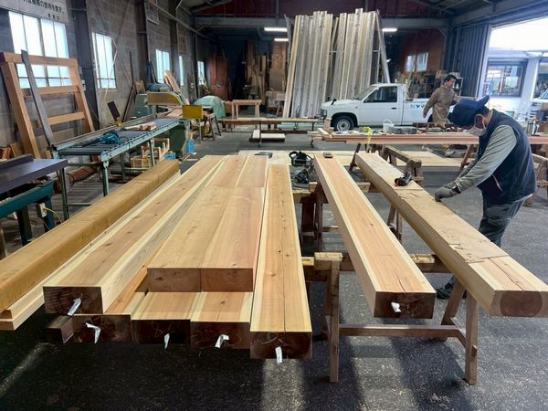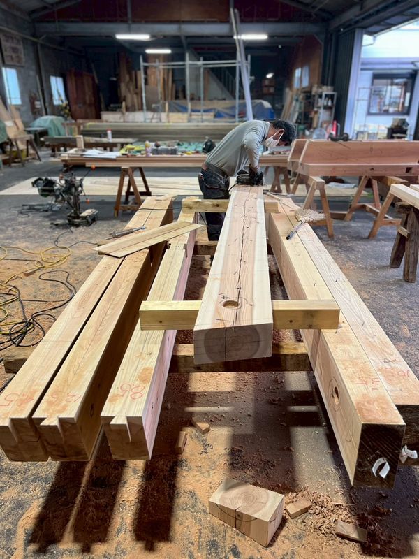 ヤマタケの工場では、大工さんによる材料の加工が着々と進んでいます。