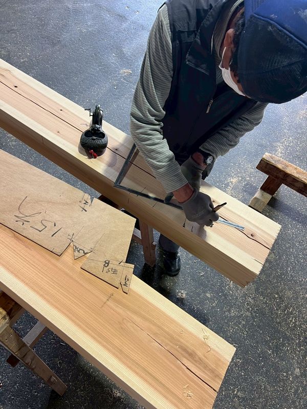 おさまりの位置が決まったら、それぞれのパーツを作り、材料に墨付けします。