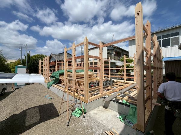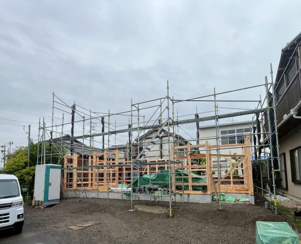 土台の据え付けが終了した焼津市W様邸の新築建て替え工事現場。
