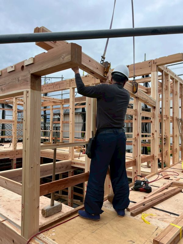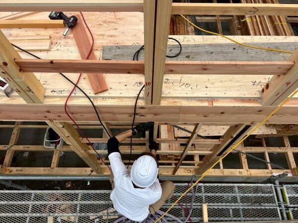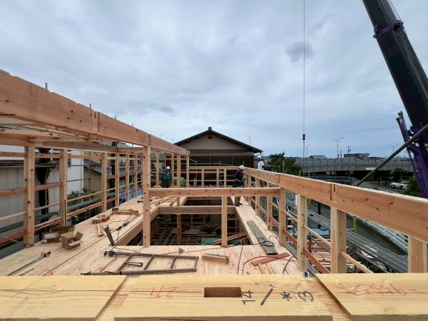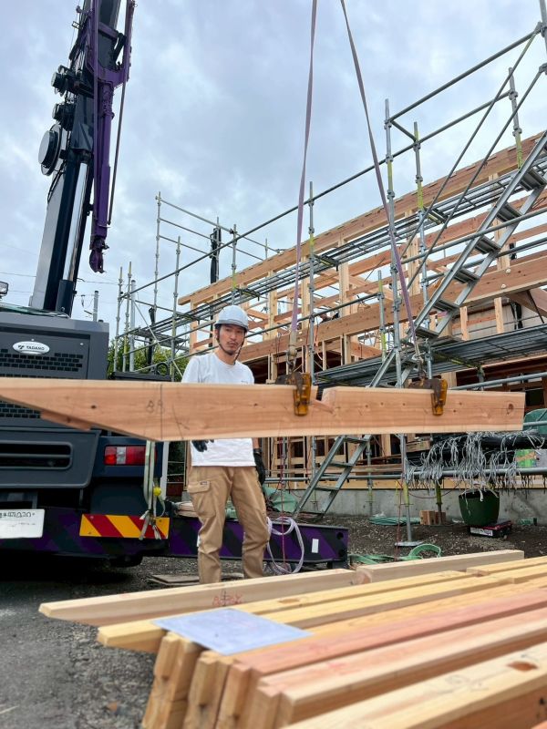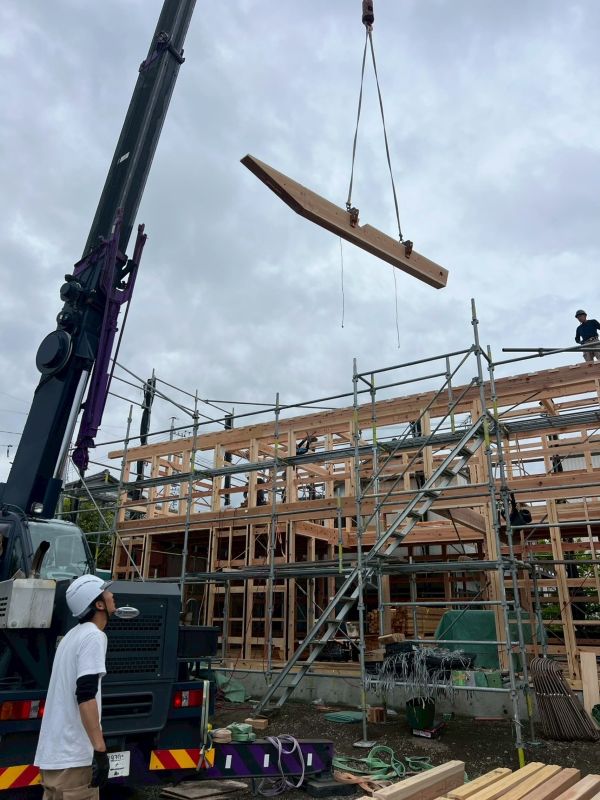 ヤマタケの工場で加工した「登り梁」をおさめていきます。