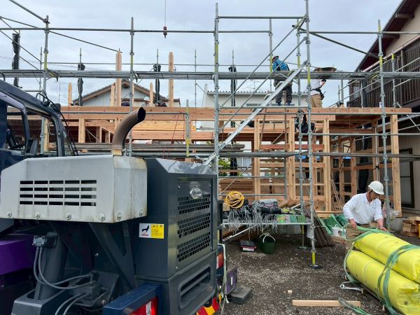前日までに柱建て、足場を組み終え、建前の準備が整いました。