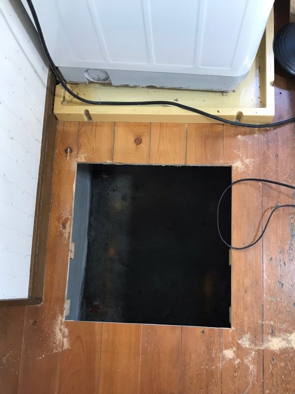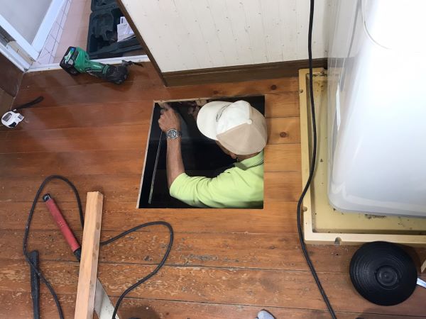 原因を突き止めるため、洗面所に新たに点検口を作って床下に潜ってみることにしました。