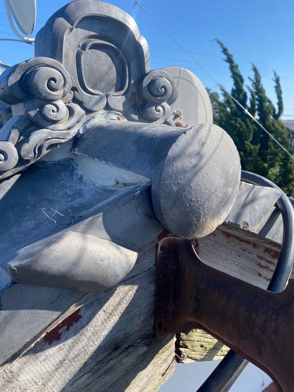 軒天工事をやるうえで、鬼瓦の漆喰が剥がれて出てきていました。