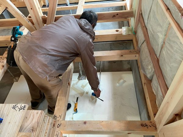 床下全面と基礎の立上り部分にも断熱材を張っていくので、なかなか時間がかかります。