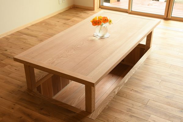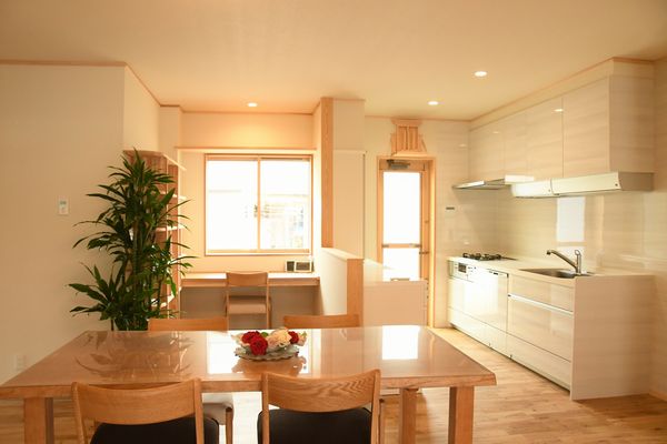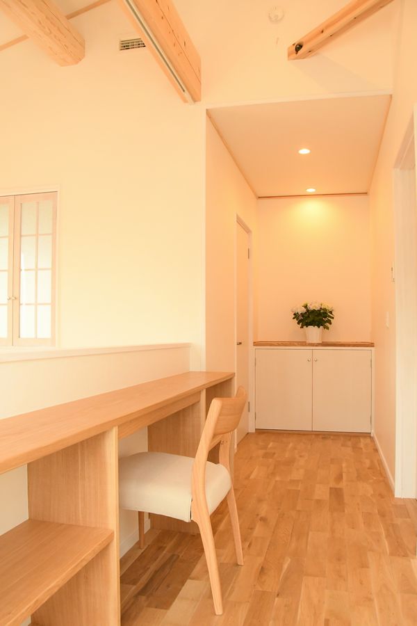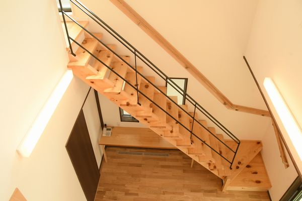 完全独立型の2世帯住宅です。親世帯と子世帯は、鍵付きのドアを経て行き来ができるようになっています。ご主人のお父様が集められた木材が保管してあり、住宅に活かしたいと、ご相談を受けました。タモの板材は、書斎スペースのカウンターや掘りごたつのテーブルとして、ヒノキの節板はストリップ階段に使用しました。お父様の想いのこもった材木が住宅の一部としてよみがえりました。