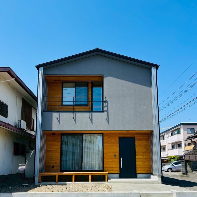 外壁はサイディング外壁に吹付塗装を施し、軒先には化粧垂木と杉板の裏板を組み合わせた和の趣ある外観。