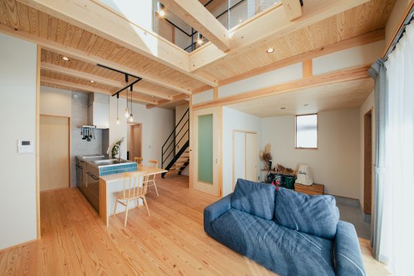 光の入り方を計算した、無垢材の美しさが際立つ吹き抜けリビング。梁や天井に使用した無垢の杉材が、やわらかな光に照らされて、木目の美しさがより一層引き立ちます。