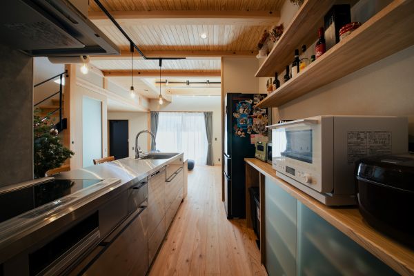 キッチンの背面には造作収納を設置。棚の高さや奥行きは、お手持ちの調理家電や食器、ストック品にぴったり合うように完全オーダーメイドで仕上げています。自然素材の木のぬくもりと使い勝手の良さを両立させた、世界に一つだけの収納スペースです。