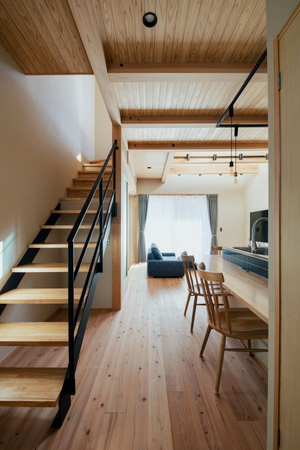階段からキッチン、リビングへと、視線と動線が自然につながる間取り。無垢の木が紡ぐやさしい空間。