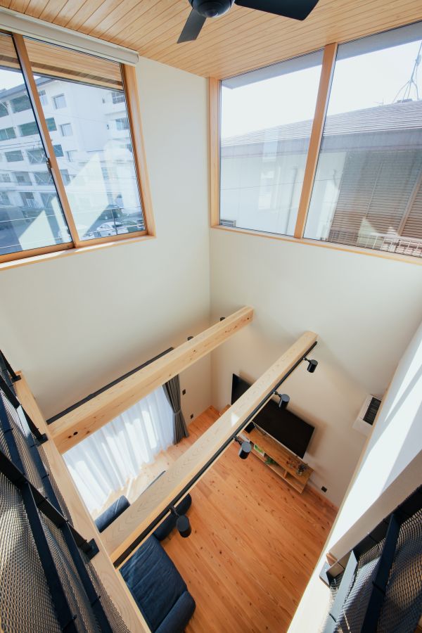 吹き抜けと無垢材がつくる、深呼吸したくなるような空間です。