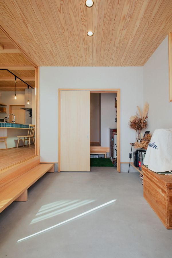 さらに、土間とリビングの間は三枚引き戸で仕切ることができ、開け放てば広々としたリビング空間に早変わり。お子さまとのびのびと過ごせる、暮らしにフィットした間取りが完成しました。