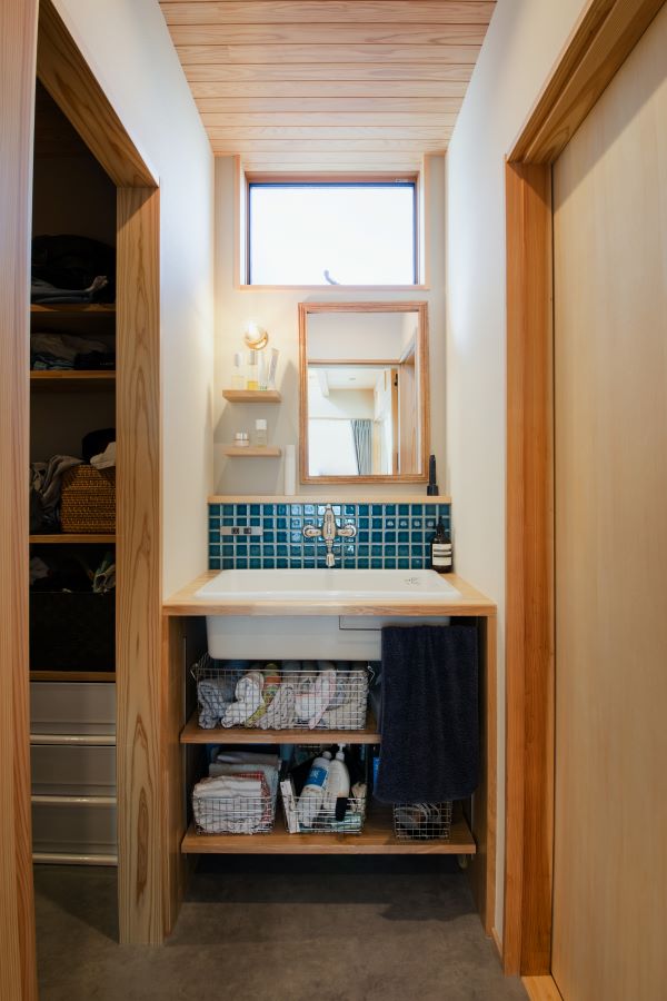 タイル・ミラー・収納棚まで自由にアレンジできる造作洗面台は、住む人のライフスタイルや好みにぴったり寄り添う一点もの。毎日の身支度が楽しくなる空間に。