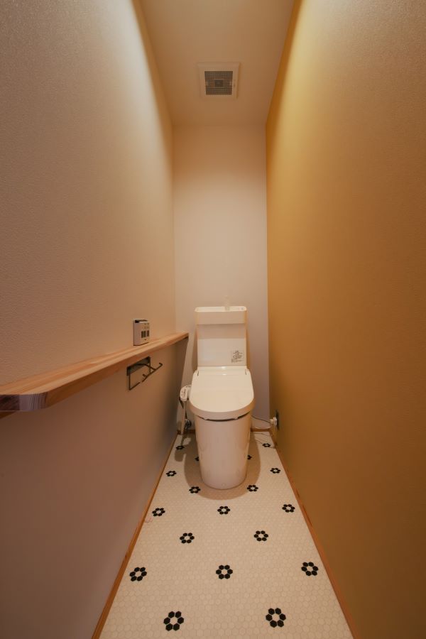 トイレ空間には、やわらかなイエローのアクセントクロスと、レトロかわいい小花柄のクッションフロアを採用。シンプルな中にも、さりげない可愛らしさと遊び心をプラス。限られたスペースだからこそ、クロスや床材で印象を変えられる、おすすめの空間です。