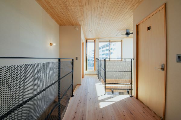 2階ホールは、天井・床ともに無垢の杉材を使用。木のぬくもりを感じながらも、ブラックのアイアン手すりが空間を引き締め、ナチュラルモダンな雰囲気に仕上がっています。