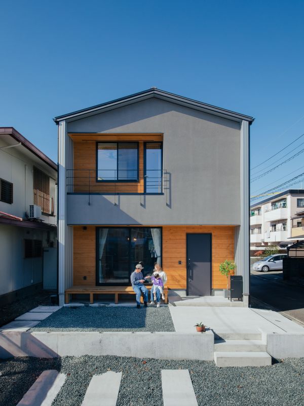 外観の仕上げには、塗り壁・無垢の杉板張り・ガルバリウム鋼板の異素材を組み合わせ、洗練された表情に。自然素材の温かみとモダンな素材感が融合し、街並みにも美しく映えます。