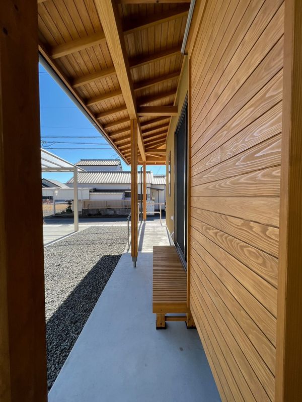 外部は無塗装のサイディングボードにリシンの吹付塗装をしています。軒先は化粧垂木に杉板の裏板を施工し、外壁と木部のコントラストが素敵に仕上がりました。