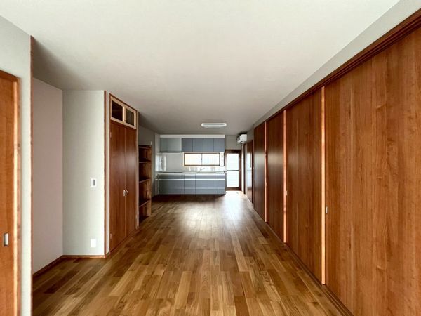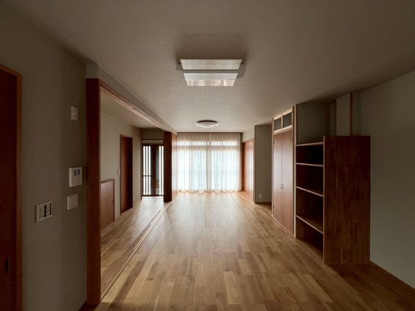 希望のサイズで大工さんに作ってもらった棚と、開けるとワンルーム風になる様に廊下とリビングを仕切る大きな4枚の扉。