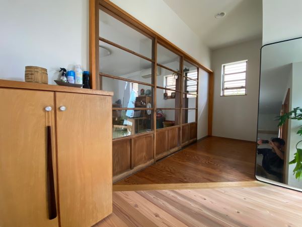 入り口を二枚戸から三枚戸に変えて開口を大きくしました 奥様こだわりのアンティークの建具をリメイクしました